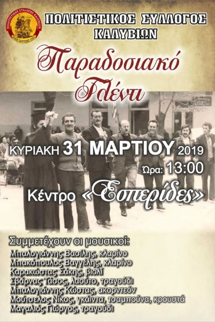 Ο Πολιτιστικός Σύλλογος Καλυβίων σας προσκαλεί σε Παραδοσιακό Γλέντι την Κυριακή 31 Μαρτίου 2019 και ώρα 13:00 στο Κέντρο Εσπερίδες στην Αγριλιά Λαμίας. Συμμετέχουν οι μουσικοί : Μπαλογιάννης Βασίλης-κλαρίνο, Μπακόπουλος Βαγγέλης-κλαρίνο, Καρακώστας Σάκης-βιολί, Σβάρνας Τάσος-λαούτο &τραγούδι, Μπαλογιάννης Κώστας-ακορντεόν, Μούτσελος Νίκος-γκάιντα & τσαμπούνα & κρουστά, Μαγαλιός Γιώργος-τραγούδι.